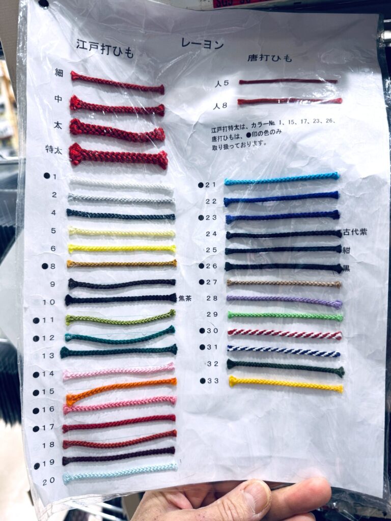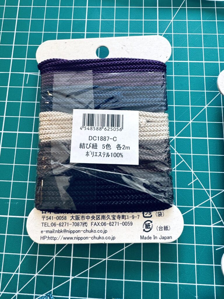 今回は、ポリエステルで、お試しの色が数色入った紐と